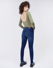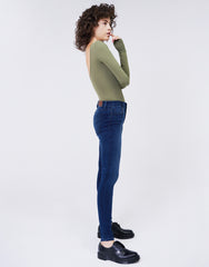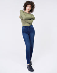 - Lean and sexy, this mid-rise skinny will hug you just right in our soft, super stretch quality denim. This style hits perfectly below your natural waist, is fitted through the hips and thighs and has a slim leg. The mid-blue inky shade has hand sanding and whisker details for an authentic worn-in look. 5-pocket styling with a button and zip fly closure. Blackened brass hardware with tonal stitching. Ankle length to show off those amazing shoes.