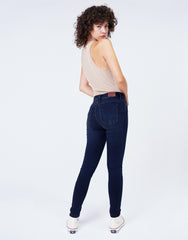 - Lean and sexy, these mid-rise skinny will hug you just right in our soft, super stretch quality denim. This style hits perfectly below your natural waist, is fitted through the hips and thighs and has a slim leg. The dark shade has mild hand sanding and whisker details for a slightly worn-in look. 5 pocket styling with a button and zip fly closure. Antique brass hardware with 2-tone stitching. Ankle length to show off those amazing shoes.