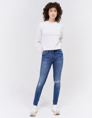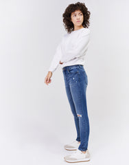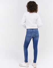 - The mid-rise fit we can't get enough of. Kora Ride in our soft, super stretch quality denim is the style you need. This style hits below your natural waist with a slim leg. This beautiful dark indigo will elevate your wardrobe, with 4-pocked styling and a button and zip fly closure. Antique nickel hardware with contrast stitching.