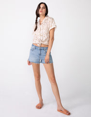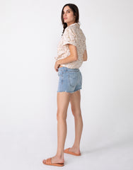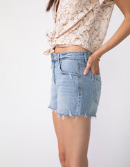 - Soft and slouchy, you're gonna want to live in our boyfriend cut-offs. This style sits on your hips and has a mild drop crotch with just the right amount of slouch through the hips and thigh. This lightweight denim is a comfort stretch with an authentic appeal. This pretty blue shade is stonewashed, hand sanded and whiskered for an authentic vintage look. Minimal destruction placed just right, mimics the look of natural wear and tear. 5-pocket styling with a button and zip fly closure. Antique pewter hardware with contrast stitching.