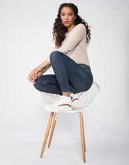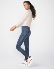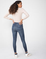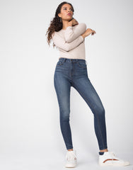 - Olivia is our tried and true high waisted top seller! Flattering from every angle, this jean will fit you like a glove in our soft, super stretch quality denim. This style hits right above your natural waist, and is fitted through the hips and thighs, and has a slim leg. This classic, the rich indigo wash will become your new go-to piece that can be dressed up or down and will stand the test of time as a true staple. Olivia features 5-pocket styling with a button and zip fly closure, blackened copper hardware, and contrast stitching.