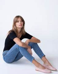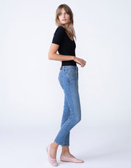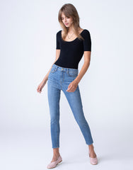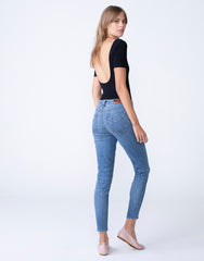- DESCRIPTION These high-rise skinnies will fit like a glove in our soft, super stretch, quality denim. This style hits at your natural waist is fitted through the hips and thighs and has a slim leg. This pretty light shade has gentle hand sanding and whisker details for a natural worn-in look. 5-pocket styling with a button and zip fly closure. Antique pewter hardware with soft contrast stitching. Elongate those legs with this ankle-length cut.